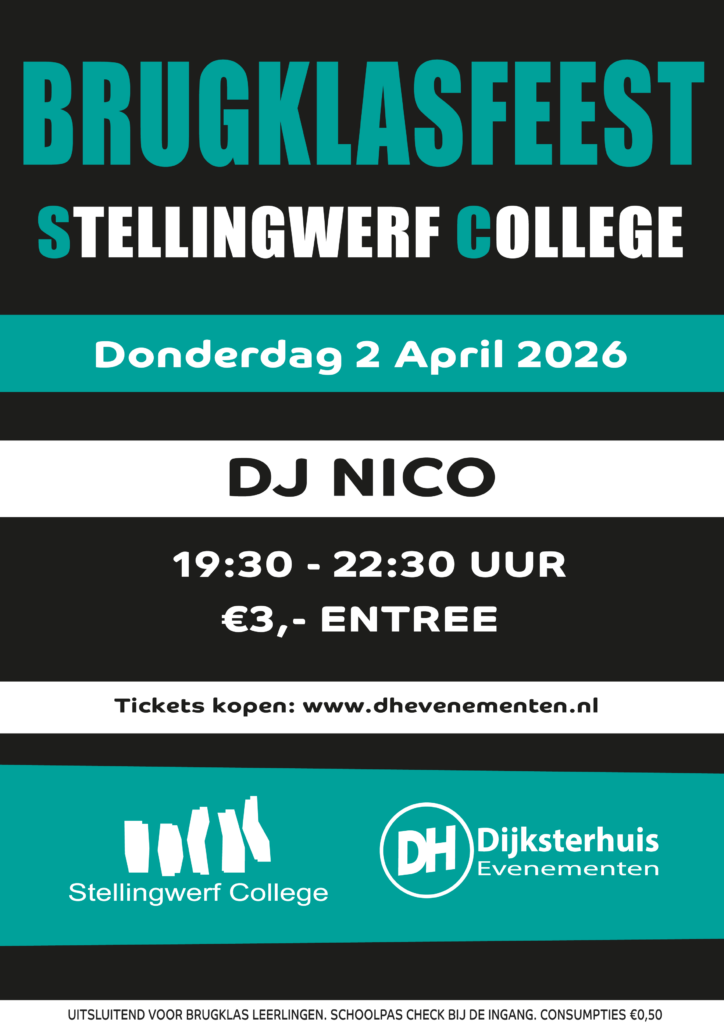 YES! Op donderdag 2 april gaan we los in de aula van het Stellingwerf College. Met DJ NICO gaat het zeker een top feest worden! Alle 1e jaars leerlingen zijn uitgenodigd. We gaan de hele aula omtoveren tot een top evenementen locatie! Zien we jou ook?